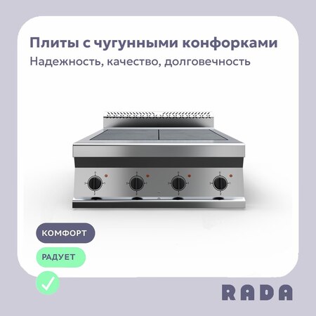Заказывайте плиты с долговечными и эффективными чугунными конфорками Rada™ в компании Юниторг. Наши специалисты ответят на все интересующие вопросы и помогут в выбором. Заявки на сайте или по телефонам 8 800 505 9676, +7(351) 245-46-15, +7(343) 226-19-10.