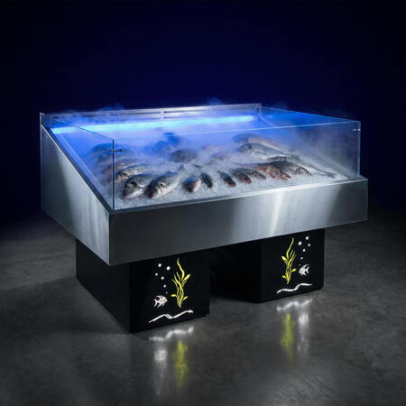 Основное назначение витрины VFgt: охлаждение и демонстрация рыбы и морепродуктов на льду вместе с системой туманообразования.