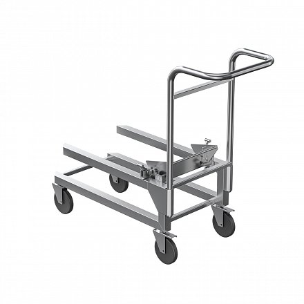 Тележка изготовлена из нержавеющей пищевой стали и предназначена для размещения на ней Шпильки для АПК-20-1.1-03-1. Тележка позволяет легко фиксировать шпильку благодаря наличию специальных запорных механизмов. Благодаря обрезиненным колесам большого диаметра 125 мм и углу их поворота в 360° тележка обладает высокой маневренностью. Съемная ручка позволяет уменьшить занимаемое тележкой место, когда она не используется.