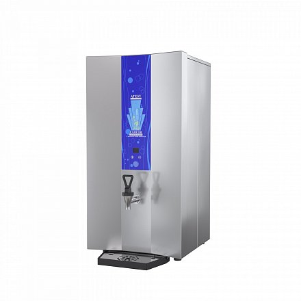 Корпус кипятильника изготовлен из нержавеющей стали AISI430. Внутренняя часть кипятильника состоит из кипятильного сосуда и сборника кипятка. Они изготовлены из нержавеющей стали AISI304. Вода из водопроводной сети поступает в кипятильный сосуд, где расположен ТЭН мощностью 3 кВт – 1шт. ТЭН осуществляет нагрев воды до температуры кипения. В процессе кипения вода поступает в сборник кипятка. Сборник кипятка оснащен собственным ТЭНом мощностью 1 кВт, который поддерживает заданную температуру воды для раздачи. Управление поддержанием температуры воды в накопителе производится с электронной панели. Кипяток из кипятильника можно получить путем открывания крана, расположенного на корпусе, кран имеет два положение открыто постоянно и открыто при нажатии. Специальная конструкции кипятильника не позволяет попадать сырой воде в емкость с кипяченной, в случае отказа автоматики сырая вода будет сбрасываться в канализацию. Специальная конструкция крышки не позволяет конденсату стекать на корпус кипятильника. Кипятильник может устанавливаться либо на имеющиеся столы, либо на специальную подставку (поставляется отдельно).