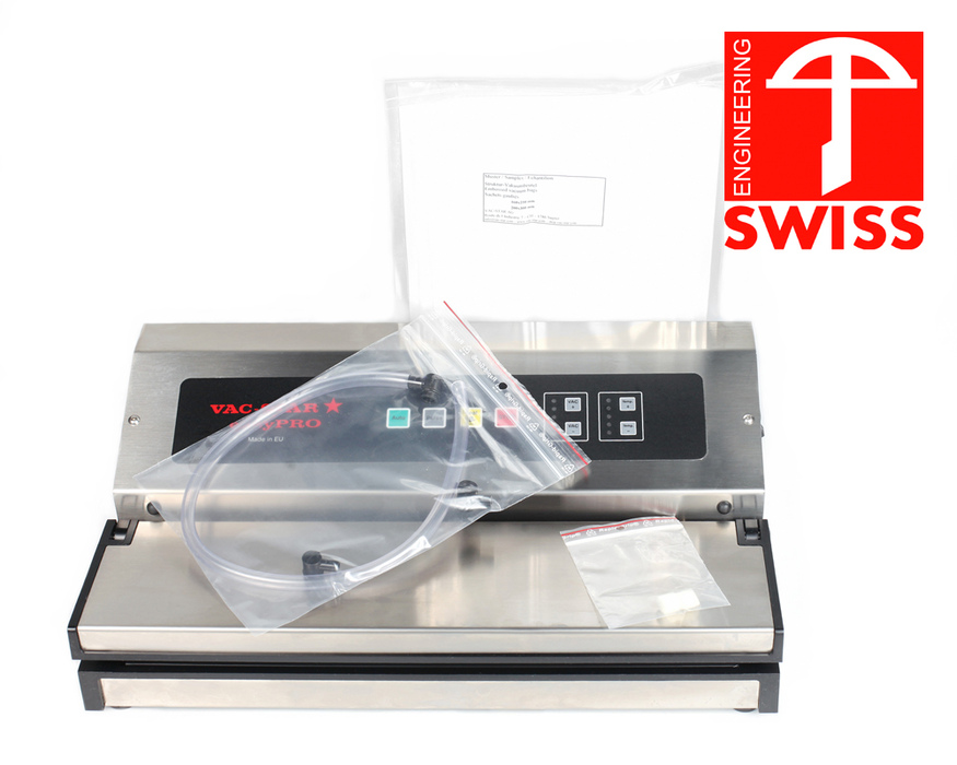 VAC-STAR EasyPro вакуумный упаковщик бескамерного типа. Профессиональный прибор, разработанный швейцарской компанией VAC-STAR для малого бизнеса и домашнего использования. Компактный и стильный упаковщик изготовлен из нержавеющей стали 18/10 и оснащен интуитивно понятными элементами управления.