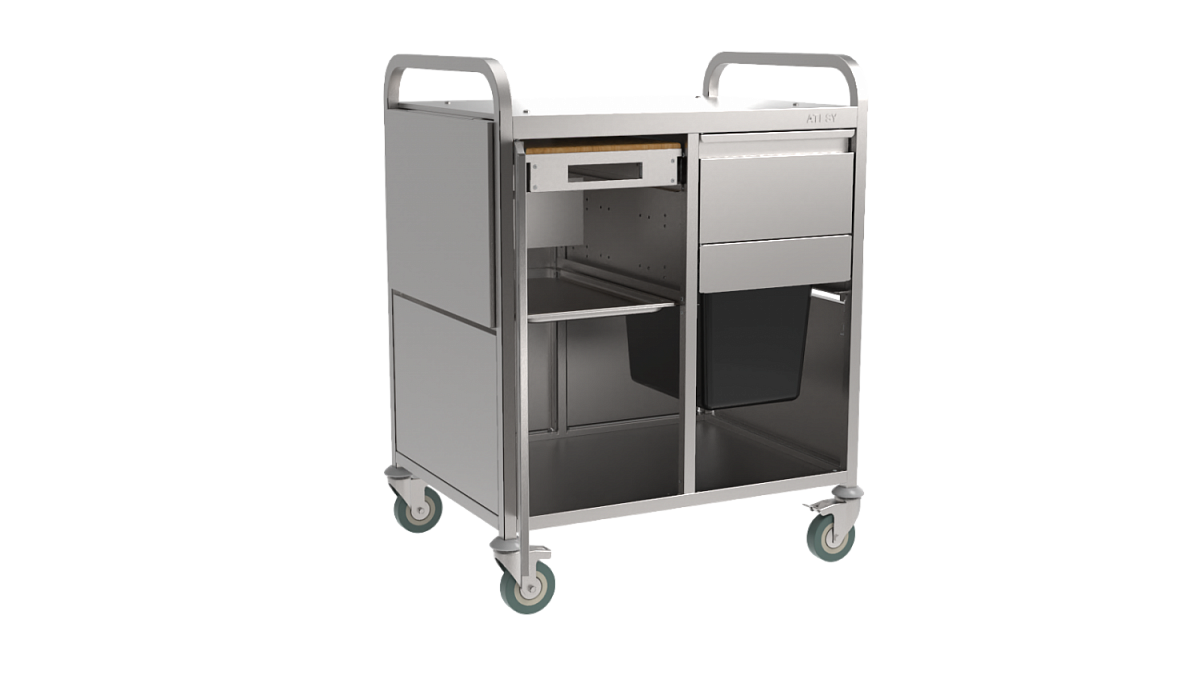 Подставка под гриль-шашлычницу ПГШ предназначена для установки и транспортировки гриля-шашлычницы и работы с ним. Детали подставки выполнены из легированной стали. Подставка имеет рамно-стеллажную сварную конструкцию. Стойки выполнены из труб квадратного сечения. Передвижение тележки осуществляется на четырех поворотных колесах диаметром 100 мм, два из которых имеют тормозное устройство. На столешнице установлены резьбовые втулки для фиксации гриля. По бокам столешницы установлены откидные полки. Под столешницей можно разместить выдвижную разделочную доску (заказывается отдельно) с гастроемкостью для сбора нарезанных продуктов, ящик для инвентаря (заказывается отдельно), выдвижную урну (заказывается отдельно). На стойках подставки установлены направляющие для гастроемкости, которую можно использовать в качестве полки, делящей пространство.