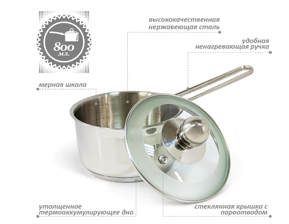 Сотейник-ковш ZEIDAN со стеклянной крышкой 0,8 л для всех видов плит