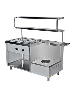 Мармит универсальный первых и вторых блюд предназначен для демонстрации, кратковременного хранения и раздачи посетителям супов, бульонов, каш, а также вторых блюд и соусов в горячем состоянии.  Над мармитом расположена двухярусная полка, на которой размещаются порционные блюда. Мармит комплектуется гастроемкостями  GN-1/1, GN-1/2, GN-1/4.