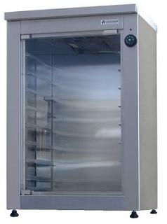 Шкаф для расстойки теста, имеет 8 уровней для установки противней размером 435х330мм. Изготовлен из нерж.стали. Оборудован стеклянной дверью, за счет  дополнительнымх кронштейнов может размещать посуду и противни меньшего размера. Распределение тепла происходит за счет естественной конвекции. Диапазон регулирования температуры - +15 - +90 °С. На крышку шкафа РТ-435-ПК предусмотрена установка пароконвекционой печи ПКУ-435.