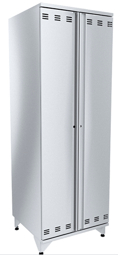 Шкаф двухстворчатый с распашными дверями. Может использоваться для хранения хлеба, продуктов, инвентаря. В каждой секции по 5 полок из нержавеющей стали. Шкаф изготовлен из стали окрашенной порошковой краской серого цвета. Имеет регулируемые по высоте ножки. Поставляется в собранном виде. Упаковка стрейч пленка.