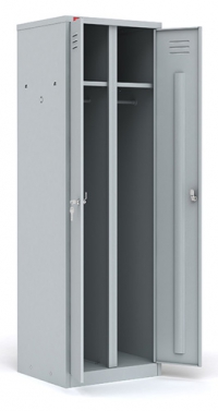 Шкаф металлический разборный двухсекционный, предназначен для хранения сменной одежды. В стандартную комплектацию каждой секции входят съемная полка для головного убора, перекладина для вешалки и крючки для одежды, врезной замок. Шкаф может комплектоваться полками для обуви и регулируемыми опорами (в комплект не входят). Полимерное порошковое покрытие светло-серого цвета (RAL 7035).