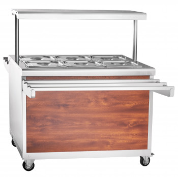 Мармит 2-х блюд ЭМК-70ПМ паровой (полка с подсветкой,с г/емкостями,1120 мм.) Прилавок-мармит электрический передвижной предназначен для организации буфетов и шведских столов в ресторанах и кафе с предоставлением горячих блюд. Мармит имеет интегрированное освещение. Ванна и все каркасные элементы выполнены и из высококачественной нержавеющей стали. Кашированный под дерево - цвет дуб.