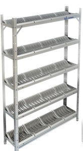 Стеллаж кухонный. Стойки из нержавеющей стали AISI 430, полка из нержавеющей стали AISI 430 с кассетами из пищевого пластика на 250 тарелок, поддон из нержавеющей стали AISI 304. Используются в моечном отделении для сушки и кратковременного хранения чистой посуды. Стеллаж сделан из стоек и полок. Полка состоит из кассеты для тарелок и каркаса. Кассета представляет собой решётку с ячейками, в которые помещаются тарелки. Кассета изготовлена из пищевого пластика, каркас из нержавеющей стали марки AISI 430. Внизу стеллажа расположен поддон, предназначенный для сбора жидкости, поступающей с мокрой посуды. Поддон изготовлен из пищевой нержавеющей стали марки AISI 304. Высота полок регулируется. Шаг регулировки - 100 мм. Ножки стеллажа снабжены регуляторами высоты, что позволяет устранить неровности пола и дополнительные конструктивные элементы, предназначенные для предотвращения его раскачивания во время работы и придающие большую устойчивость. Универсальная конструкция позволяет легко производить сборку стеллажей. При необходимости можно приобрести любое количество полок дополнительно.