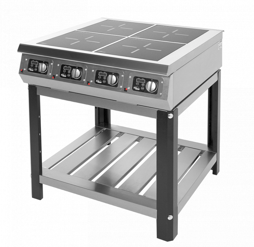 Плита индукционная 4-х конфорочная Ф4ИП/800 - электрическая индукционная плита с безымпульсными режимами работы, выполнена полностью из нержавеющей стали, ноги подставки окрашены в черный цвет, разборная конструкция плиты и подставки.