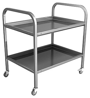 Тележка состоит из: опорных дуг, выполненных из нержавеющего квадратного профиля 20х20мм,  двух поддонов из пищевой нержавеющей стали AISI 430 и четырех поворотных колес (одно колесо оборудовано тормозом).