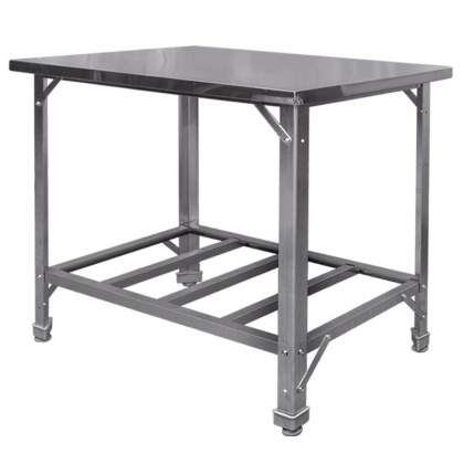 Столешница выполнена из нержавеющей стали, укреплена плитой ЛДСП для увеличения прочности конструкции. Каркас и полка-решетка — оцинкованная сталь. Материалы не впитывают запахи, легко очищаются от загрязнений моющими и дезинфицирующими средствами. Ножки стола с регуляторами высоты для устойчивой фиксации на неровном полу.