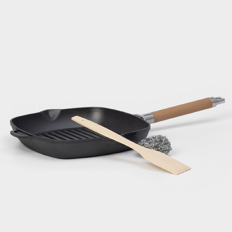 Сковорода - гриль чугунная Wild Kitchen, 26×26 см, лопатка и губка в комплекте