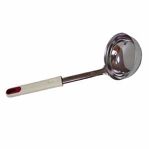 Ложка разливательная - для порционирования первых и третьих блюд. «Премьера» – это яркое современное оформление, удобные рабочие поверхности кухонных приборов. Все ручки у изделий пластмассовые, белого цвета с красными ободками в отверстиях для подвеса. Все изделия изготавливаются из высококачественной нержавеющей стали AISI 304. Она разрешена для контакта с пищевыми продуктами и не влияет на вкус и запах приготовленных блюд.