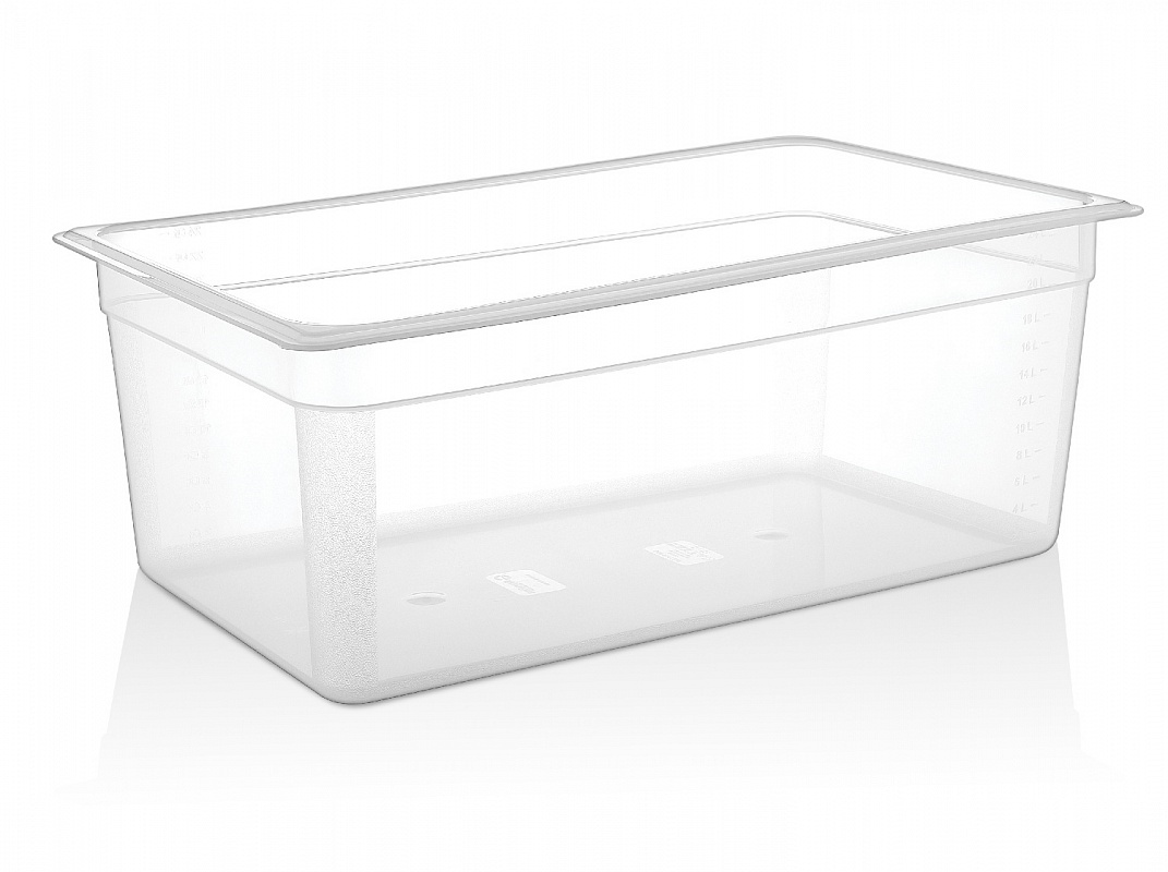Гастроемкость GN 1/1 (530*325*200 мм) из полипропилена обладает устойчивостью к температурам от -40 до +100°c. Предназначена для хранения и транспортировки пищевых продуктов. Возможность штабелирования экономит место при хранении. Подходит для мытья в посудомоечной машине.