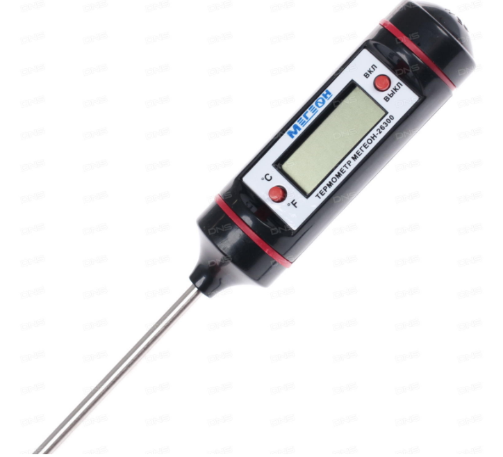 Мегеон 26300 оборудован жк-дисплеем, на который крупными цифрами выводятся показания. Они могут отображаться в градусах Цельсия или Фаренгейта. Защитный колпачок убережет щуп от загрязнения во время хранения. Сам зонд изготовлен из устойчивой к коррозии и разрушающему воздействию агрессивных сред нержавеющей стали.