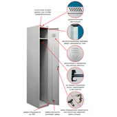 Разобранный,   1 секция, 1 дверь, 2 крючка, 1 полка под головной убор,1 замок повышенной секретности1 перекладина, металл - 0,7мм В комплекте поставляются саморезы, клёпки, болты. Покрытие полимерно-порошовое светло-серого  цвета.