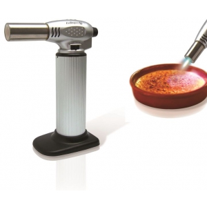 Горелка для карамелизации. Проста и надёжна в применении при помощи кнопки пьезоэлемента, автоматического включения, с регулируемым пламенем. Используется с бутаном (газ для зажигалок). Лёгкая заправка.