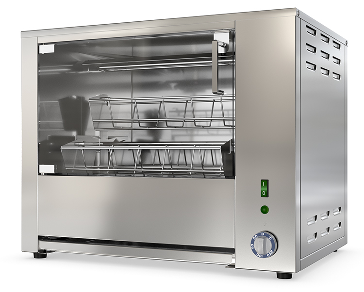 Гриль для кур ATESY Командор-4Э-Т используется на предприятиях общественного питания и торговли для приготовления куриных тушек, окорочков, крылышек и грудок, сарделек, шпикачек и колбасек. Модель оснащена электродвигателем, обеспечивающим вращение 4 садков. Дверцы выполнены из закаленного стекла, корпус - из нержавеющей стали AISI 430, садки - из нержавеющего прутка, ручки - из термостойкого пластика.