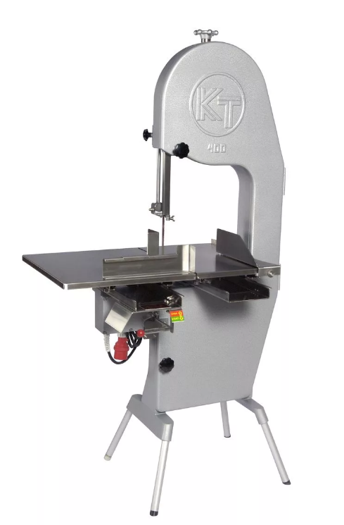 Пила для мяса Koneteollisuus Oy (KT) 400 используется на предприятиях пищевой промышленности и торговли для нарезки на куски свежего и замороженного мяса, рыбы и птицы. Модель с 1 скоростью оснащена подвижным столом и тормозным двигателем, благодаря которому режущее полотно останавливается мгновенно после отключения электропитания. Рабочее полотно, защитный кожух и кожух полотна выполнены из нержавеющей стали, корпус пилы и ножки - из алюминия.