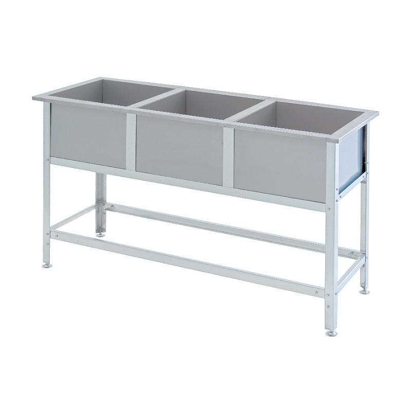 Ванна моечная ВСМ-Б-3.530-02 - серии Бюджет используется на предприятиях общественного питания и торговли для мытья столовой и кухонной посуды, инвентаря, овощей и фруктов, а также для оттайки замороженных пищевых продуктов. Каркас выполнен из профиля из оцинкованной стали толщиной 1,2 мм, ванны - из нержавеющей стали AISI 430 толщиной 0,7 мм, опоры регуляторов высоты ножек - из нержавеющей стали. 3 секции 530х530х400 мм, ванна секционная моечная ВСМ сварная изготовлена из нержавеющей стали – AISI 430, каркас - оц. сталь