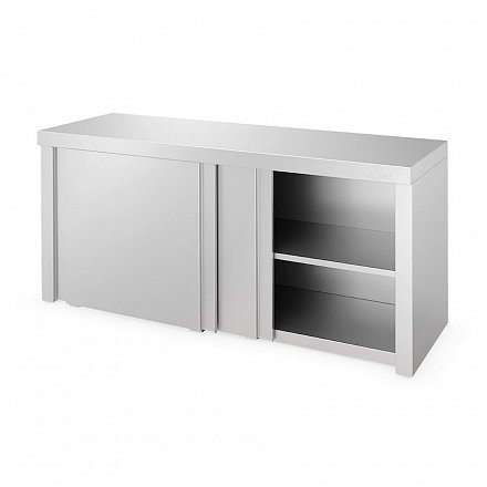 Полка оснащена внутренней полкой из нержавеющей стали. Две двери-купе выполнены из нержавеющей стали и имеют фиксатор, предотвращающий ее закрывание в открытом состоянии. В комплект поставки входит крепежная планка и метизы для крепления полки к стене.