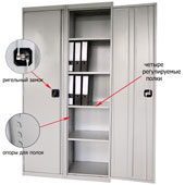 В каждой секции по 4 регулируемых полки, в каждой секции ригельный замок с ручкой.
