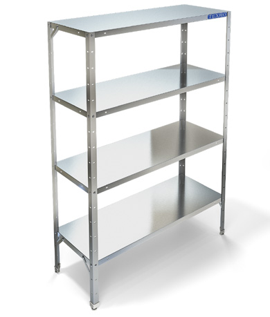 Кухонный стеллаж Техно-ТТ СТР-324/1500 предназначен для хранения посуды, различного инвентаря и сухих продуктов на предприятиях общественного питания и торговли. Модель оснащена регулируемыми по высоте полками и ножками, что позволяет компенсировать неровности пола. Разборный каркас выполнен из уголка 40х40 мм из нержавеющей стали AISI 430 толщиной 2 мм, сплошные полки - из нержавеющей стали AISI 430.