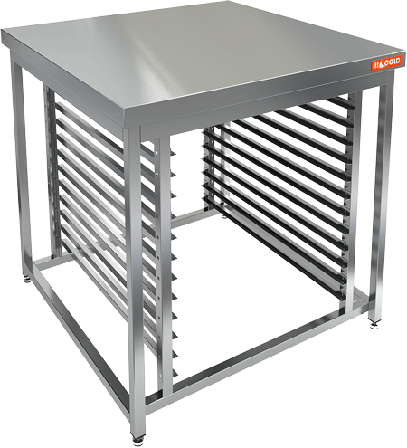 Подставка HICOLD НППК-9/9/9 из нержавеющей стали AISI 430 оснащена направляющими для противней, используется как вспомогательное оборудование под пароконвектомат на профессиональных кухнях.
