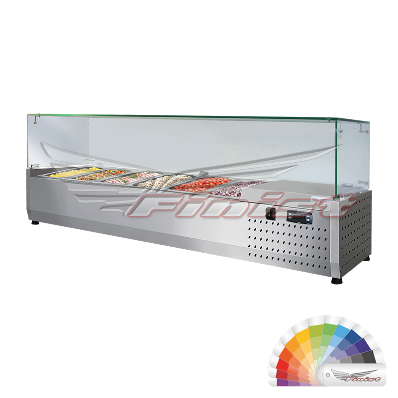 Холодильная настольная витрина ToppingBox открытая предназначена для демонстрации и кратковременного хранения подготовленных начинок/топпингов (для пиццы, блинов, лапши WOK), а также мясных изделий и полуфабрикатов на предприятиях быстрого питания и торговли. Пониженная температура позволяет в течение длительного времени сохранять вкусовые качества, внешний вид иструктуру продуктов. Прибор оснащен статическим охлаждением. Гастроемкости GN1/3 и GN1/2 глубиной 150мм приобретаются отдельно. Холодильная витрина - хорошее дополнение к холодильному столу или блинной станции.