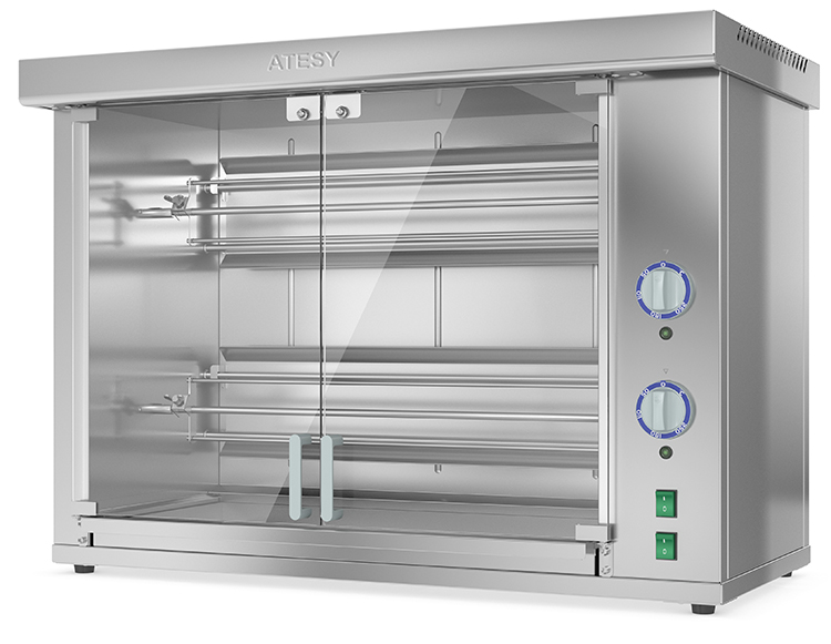 Гриль для кур шампурного типа Командор-2/2М - используется на предприятиях общественного питания и торговли. Модель оснащена электродвигателем, раздельными терморегуляторами для каждой группы ТЭНов, съемными шампурами, внутренней подсветкой камер и поддоном для сбора жира. Корпус и все внутренние элементы выполнены из пищевой нержавеющей стали, дверцы - из термостойкого ударопрочного стекла с добавлением горного хрусталя, ручки дверей - из термостойкого пластика, и ножки - из пластмассы.
