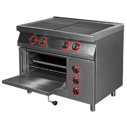 Плита профессиональная электрическая ПЭ-0,48ШП 4-х конфорочная с жарочным шкафом с лицевой панелью из нержавеющей стали, придающей изделию привлекательный внешний вид.