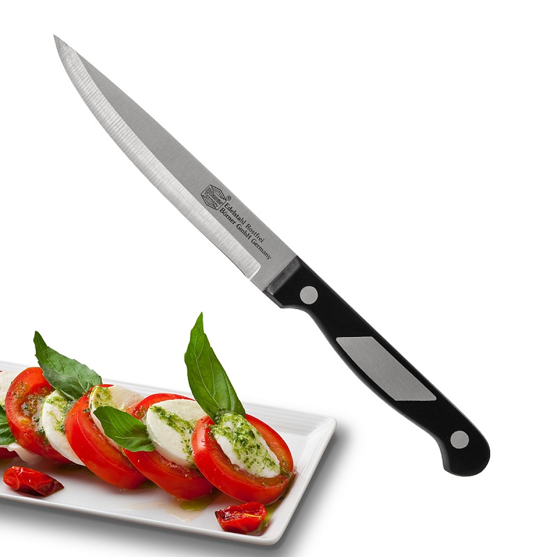 Самый популярный из всех ножей. Это легкий и многофункциональный нож для резки небольших овощей и фруктов, колбасы, сыра, масла. Имеет не широкое лезвие, острие обычно сцентрировано. Один из самых нужных на кухне ножей.