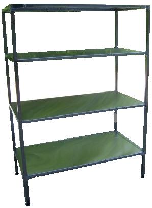 Стеллаж для хранения продуктов, каркас выполнен из крашеного уголка, полки —  сплошные из н/стали толщиной 1 мм. Габариты изделия, Д×Ш×В, 1000*400*1550 мм. Максимальная нагрузка на полку, кг 50. Ножки регулируются по высоте.