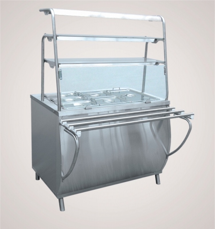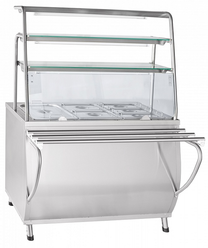 Мармит 2-х блюд ЭМК-70Т паровой (3 полки, подсветка,с гастроемкостями, 1120 мм.). Предназначен для кратковременного сохранения в горячем состоянии первых и вторых блюд в гастроемкостях и раздачи их потребителям. Внизу нейтральный шкаф для хранения кухонного инвентаря. Плавная регулировка температуры от 30 до 850С. Способ обогрева гастроёмкостей - горячим паром, в качестве нагревательных элементов применяются 2-а ПЭНа, расположенных под ванной. Цельностянутая ванна со сливом легко поддаётся обслуживанию и гигиенической обработке. Внизу нейтральный шкаф с дверками - купе для хранения кухонного инвентаря. Трёхярусная полка над мармитом обеспечивает большую полезную площадь для выкладки блюд. Гастроёмкости отделены от посетителей перегородкой из закалённого стекла. Гастроемкости и направляющие для подносов входят в комплект поставки. Мармит имеет регулируемые по высоте ножки.