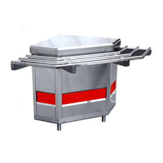 Модуль поворотный внешний служит в качестве нейтрального стола, одновременно позволяя выстраивать технологическую линию под углом 90*, не разрывая линию направляющих для подносов. Все элементы модуля изготовлены из нержавеющей стали. В комплект входят направляющие для подносов. Ножки регулируются по высоте.