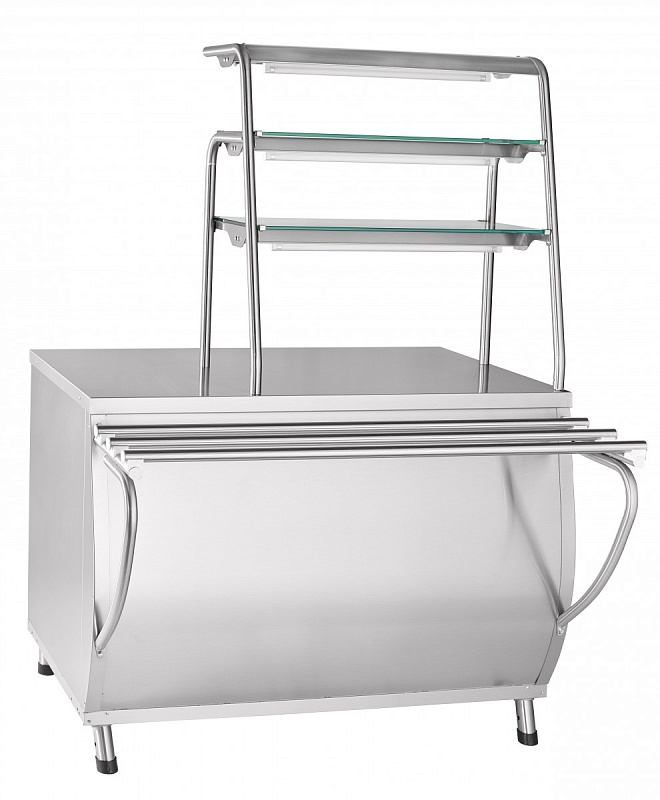 Прилавок для горячих напитков ПГН-70Т (нейтральный стол, 3 полки, 1120 мм.). Предназначен для кратковременного хранения и раздачи потребителю хлебобулочных и кондитерских изделий, а также для установки на его столе термостата с напитками. Трёхярусная полка над прилавком, каждый уровень которой оборудован лампой подсветки, служит для выкладки порционных блюд или напитков. На прилавке установлена розетка 220 В для подключения термостата или кипятильника. Внизу нейтральный шкаф для хранения кухонного инвентаря. Направляющие для подносов входят в комплект поставки. Прилавок имеет регулируемые по высоте ножки.