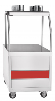 Передвижной прилавок для столовых приборов. В комплекте 4 пластиковых Перфорированных Ёмкости для столовых приборов диам. 120мм, Предназначен для хранения и раздачи столовых приборов и подносов. Ножки регулируются по высоте.