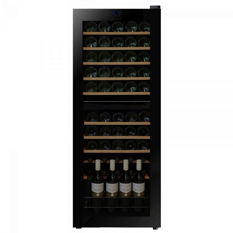 Винный шкаф DX-54.150DK выполнен в элегантном черном корпусе. Модель укомплектована десятью полками из натурального дерева и одной металлической демонстрационной решеткой для вертикальной установки бутылок. Шкаф имеет две зоны охлаждения, максимальная разница температур между ними не должна превышать 6°C. В верхней части есть сенсорная панель, с помощью которой пользователь выбирает необходимый температурный режим работы аппарата. На ней расположены сенсорные кнопки для регулировки температуры и включения освещения. Данные термостата демонстрирует цифровой экран с подсветкой. Дверца шкафа с тонированным стеклом c защитой от ультрафиолетовых лучей и встроенной ручкой, открывается на 100 градусов.
