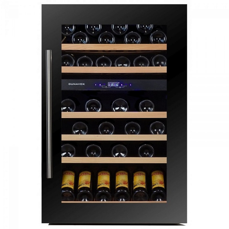Винный шкаф Dunavox DX-57.146DBK серии Built-in создает оптимальные условия для сохранения всех вкусовых свойств разливного вина. Модель оснащена сенсорной панелью управления и LED-подсветкой синего цвета в каждой зоне. Корпус выполнен из окрашенного металла, дверь - из рамы черного цвета и тонированного стекла с защитой от ультрафиолетовых лучей, полки - из нелакированного бука, накладная ручка двери - из нержавеющей стали.