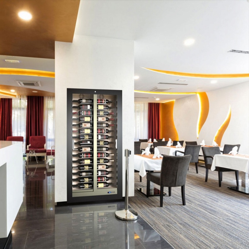 Двери винной витрины раздвижные (купе), что позволяет сэкономить пространство в помещении. Двойное закалённое стекло дверей обеспечивают как дополнительную звукоизоляцию, так и сохранность микроклимата внутри витрины. Температура внутри витрины управляется с помощью панели управления внизу и может настраиваться в зависимости от желания потребителя.
