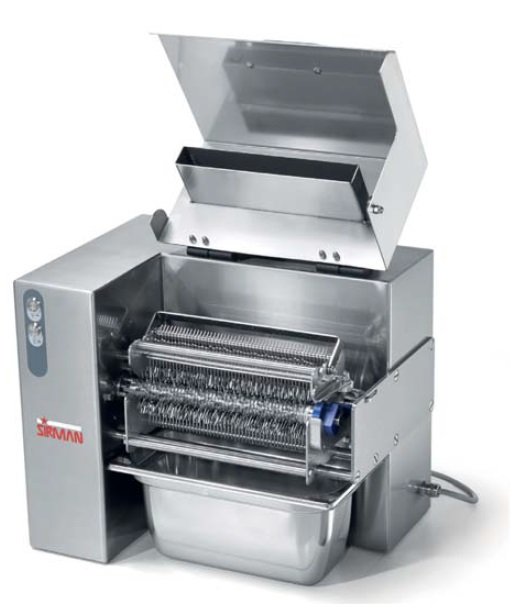 Изготовлена из нержавеющей стали AISI 304. Широкое отверстие для загрузки продуктов.  Крышка легко снимается для выполнения чистки. Простота снятия и замены блока ножей. Ножевые ролики легко снимаются для более тщательной чистки. Двойной редуктор с ремнем и коробкой шестерен в масляной ванне.