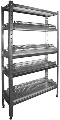 Стеллаж для сушки посуды серии «Нормал» СтПНп. Каркас — нержавеющая сталь. Стеллаж предназначен для использования в технологических помещениях предприятий общественного питания для сушки кухонной посуды и инвентаря. Полки выполнены из пищевой нержавеющей стали. Каркас стеллажа разборный. Стеллажи имеют 5 полок, две из которых предназначены для сушки тарелок, а две для сушки стаканов.