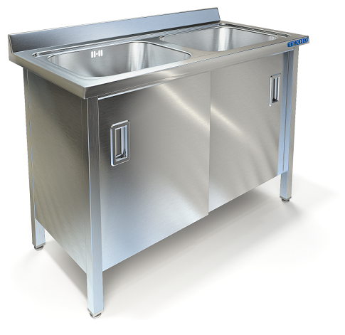 Данная модель ванны укомплектована четырьмя регулируемыми по высоте ножками и шкафчиком для хранения моющих средств или кухонного инвентаря. Раздвижные дверки-купе шкафчика, как и весь каркас, выполнены из нержавеющей стали AISI 304.