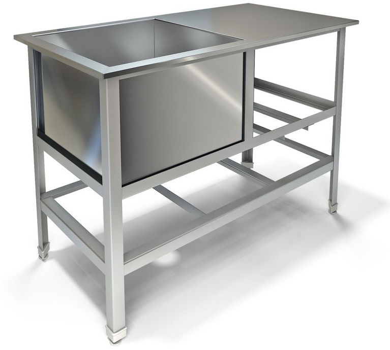 Одна сварная ёмкость размером 430х430х300 из нержавеющей стали марки AISI 304 толщиной 0,8мм, крыло. Каркас сварной из уголка 40х40 нержавеющей стали марки AISI 430 толщиной 2мм, внизу по периметру обвязка. Ванна комплектуется выпуском с нержавеющей решеткой и механическим запорным клапаном, диаметр выпуска 90мм, диаметр подключаемого сифона 50мм, регулируемые опоры. На дне ванны ребра (лучи) для жесткости и снижения вибрации.Ванна поставляется в собранном виде.