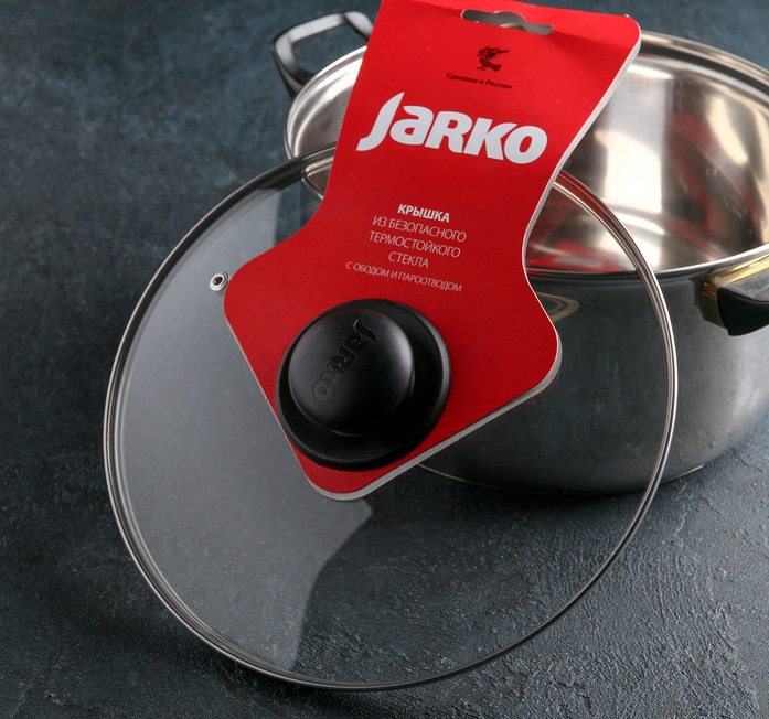 Она изготовлена из особого стекла, которое выдерживает высокие температуры и легко моется. Конструкция укреплена ободом, выполненным из высококачественной нержавеющей стали, он так же служит для предотвращения сколов и повреждений. Изделие оснащено пароотводом. Удобная ручка из термостойкого пластика не дает крышке вскользнуть из руки.