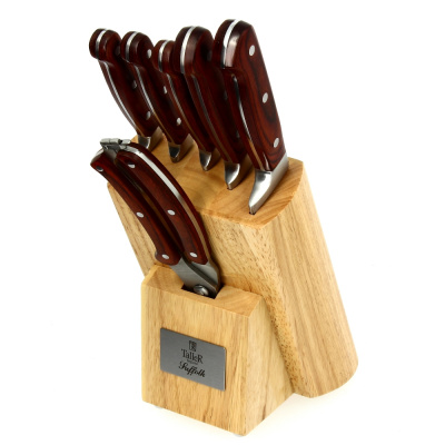 Кухонные принадлежности торговой марки Taller – это сочетание передовых технологий и традиционного английского стиля. Созданные из высококачественных материалов, они воплощают в себе функциональность, практичность и современный дизайн. Набор ножей Taller состоит из поварского ножа, ножа для нарезки, двух универсальных ножей, ножа для чистки и ножа для птицы. Лезвия ножей выполнены из легированной стали и имеют износостойкую режущую кромку. Эргономичные рукоятки из прочного пластика обеспечивают комфортный захват и предотвращают выскальзывание ножа из руки. В комплект входит стильная подставка из каучукового дерева, которая впишется в любой интерьер.