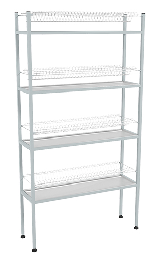 Каркас из уголка оцинкованной стали. Полки - сетка стальная хромированная. Под нижней полкой установлен поддон для сбора жидкости из нержавеющей стали. Дополнительно можно приобрести поддоны для установки под каждой полкой. Напольный стеллаж имеет регулируемые по высоте ножки. Изделие поставляется в разобранном виде. Упаковка - гофрокартон.